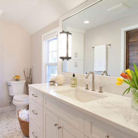 This home's original master bath was cramped, uninspiring, and not reflective of the homeowners' tastes or aesthetics. By taking over adjacent closet space, we were able to substantially expand the bathroom adding heated flooring, a beautifully tiled shower, and bench seat, with a frameless glass shower door. To adjust for the loss of closet space, we constructed his and her closets in the master bedroom flanking a set of windows. Incorporating a bench seat provides even more storage. The hexagonal floor tile and simple subway tile in the shower are reminiscent of materials used in other baths in the home. For a sense of warmth, we installed oil-rubbed bronze sconces directly on the vanity mirror and rich wood-toned barn doors at the bath entryway.